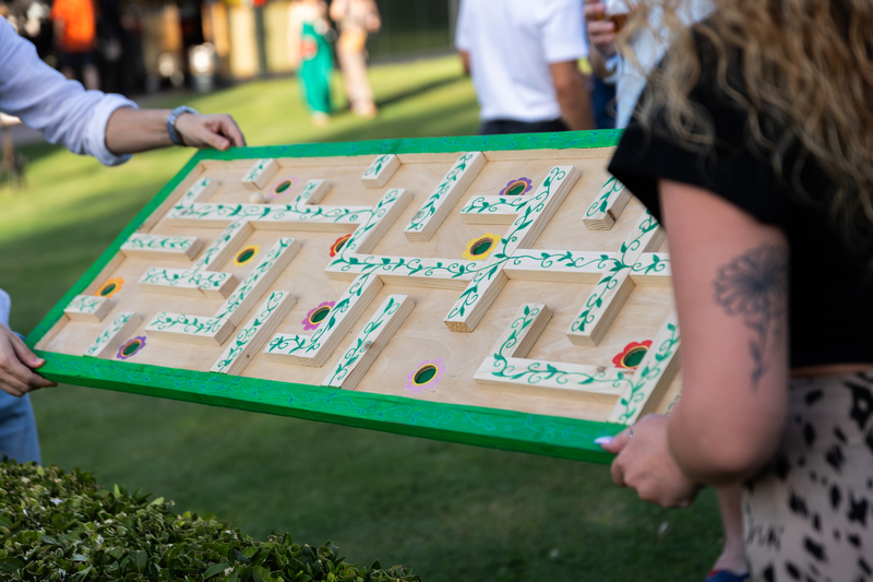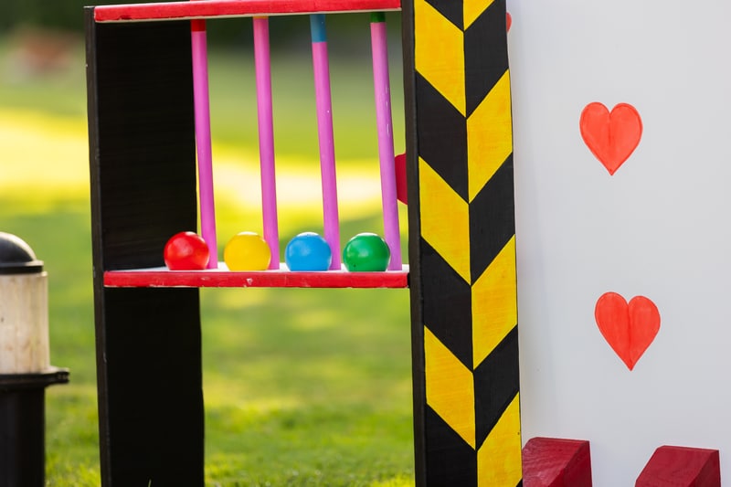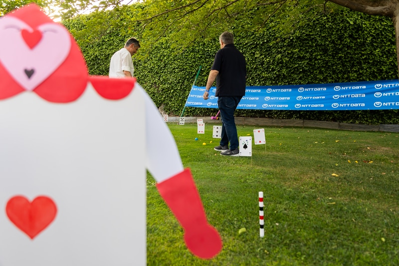 Desde su llegada, los asistentes fueron recibidos por el Conejo Blanco, quien les entregaba una llave para acceder a un rincón secreto donde podían probar suerte y ganar premios exclusivos. La jugabilidad fue el eje central del evento, con juegos temáticos como croquet con flamencos, castillos de naipes gigantes, un laberinto colaborativo y lanzamiento sobre cartas, animados por el Sombrerero Loco. Además, una máquina de aire hacía volar los corazones de la Reina de Corazones, otorgando premios sorpresa. El stand de premios estuvo atendido por el enigmático Gato de Cheshire, que aportó misterio y diversión a la experiencia.