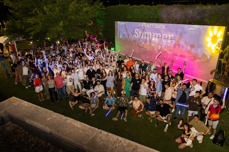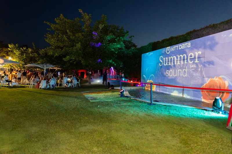 La decoración cuidó cada detalle para sumergir a los invitados en la temática, con especial atención a la identidad corporativa. En la cascada del espacio se proyectó el logo de NTT DATA, y el color azul predominó para mantener la esencia del evento y asegurar que el branding estuviera presente en cada rincón.